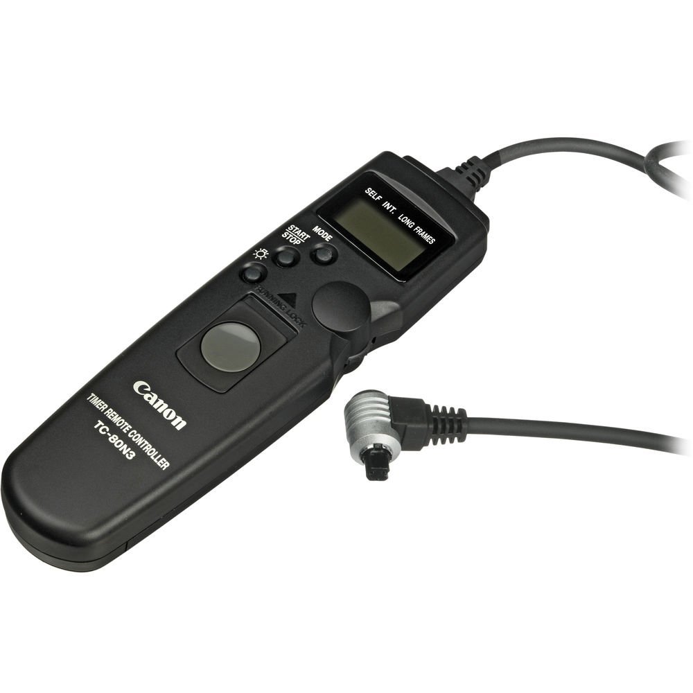 The Canon TC-80N3 Timer Remote Control is a remote switch with a 2.6′ (80cm) cord and a self-timer, interval timer, long-exposure timer, and exposure-count setting feature. The timer can be set anywhere from 1 second to 99 hours, 59 minutes, or 59 seconds. A dial enables you to easily enter the numeric settings with a single thumb. The LCD panel can also be illuminated. The rear of the controller has a hole to keep the EOS-3’s remote control socket cap.